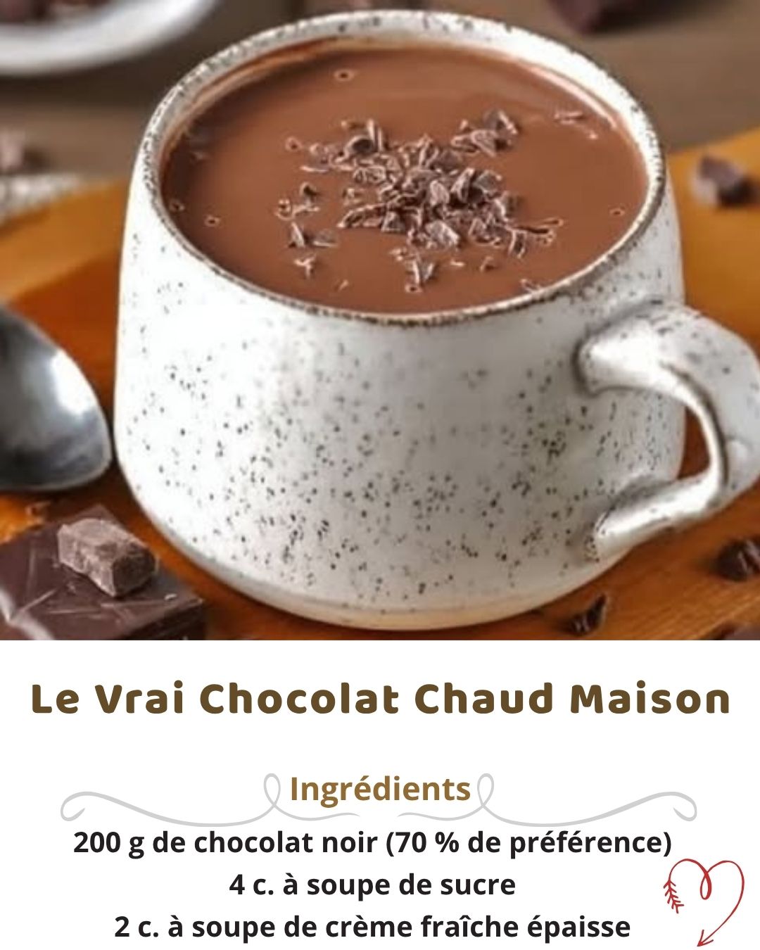 💡 Astuce d’Eva : pour un chocolat encore plus épais, diluez 1 c. à c. de maïzena dans un peu de lait froid avant la cuisson. Résultat : une texture riche et veloutée.