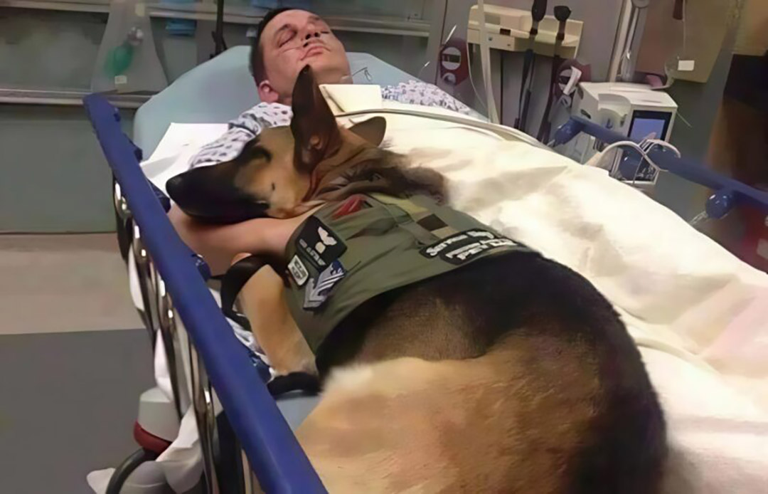 À quelques mètres de là, dans le corridor, son plus loyal compagnon attendait patiemment. Ce n’était pas un confrère en tenue, mais un magnifique chien de race berger allemand, à la fois coéquipier professionnel et ami indéfectible. Depuis le commencement de cette hospitalisation, il montait une garde silencieuse devant cette porte fermée, comme s’il saisissait intuitivement la sévérité de la situation.